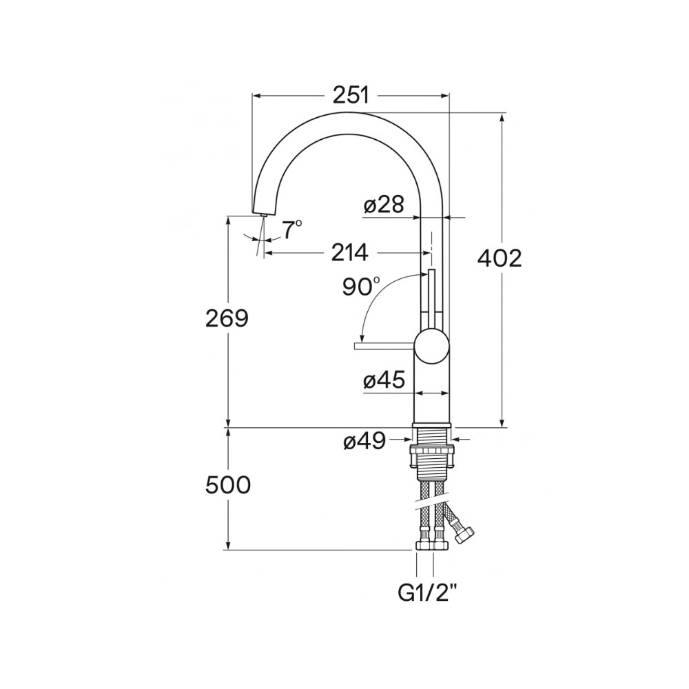 Для надёжности эксплуатации смеситель комплектуется гибкими соединительными шлангами длиной 60 см. Внутренний слой выполнен по технологии сшитого полиэтилена (PEX), что увеличивает срок службы до 50 лет. Внешняя оплётка из нержавеющей стали SUS304 защищает от разрывов и коррозии. Стандартное подключение G1/2" соответствует российским нормам, что исключает сложности при установке. Система крепления с двумя винтами гарантирует надёжную фиксацию даже в сложных условиях монтажа. Для установки потребуется только отвертка, а диаметр отверстия в мойке должен составлять 33-35 мм.