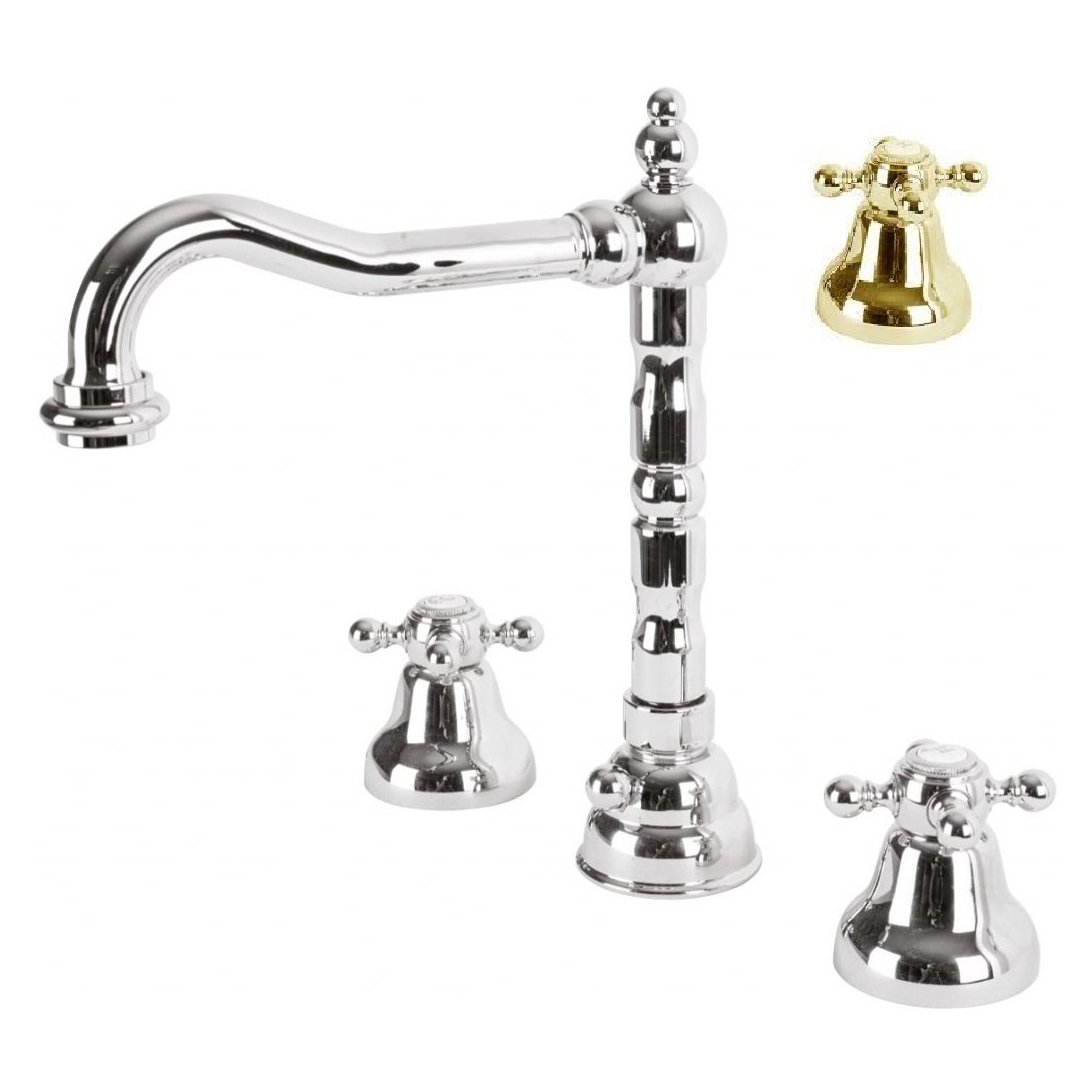 Смеситель для раковины на три отверстия с донным клапаном золото, ручки золото