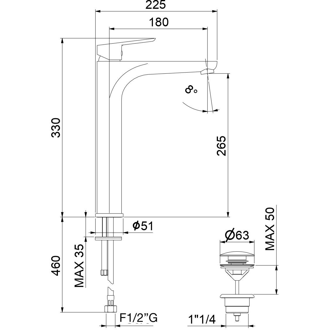 Высота излива (мм):265 p>