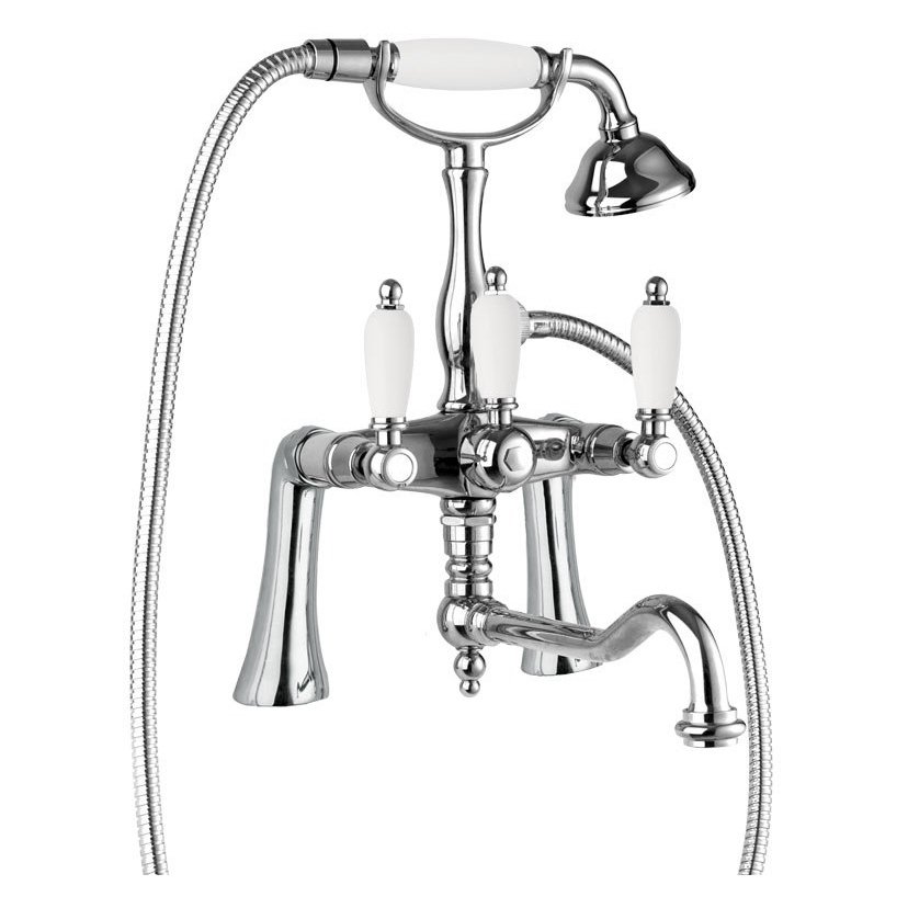 Смеситель на борт ванны с ручным душем и повортным изливом хром, ручки белые