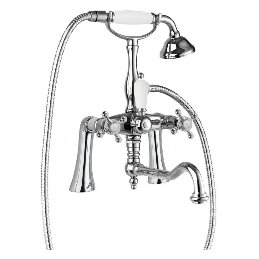 Смеситель на борт ванны с поворотным изливом и ручным душем, цвет хром, ручки переключателя и ручного душа белые