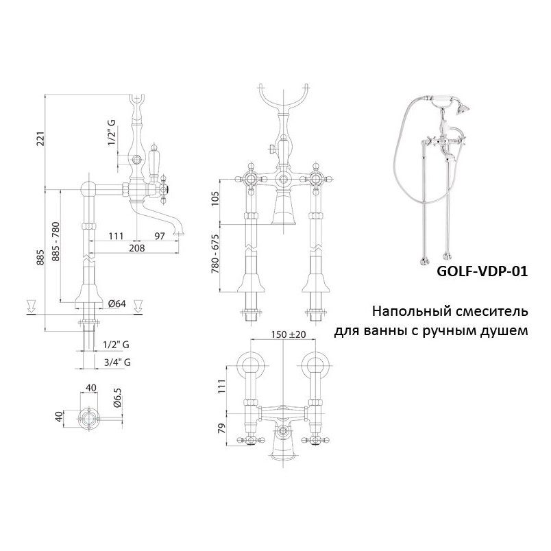 Напольный смеситель для ванны с ручным душем, цвет хром