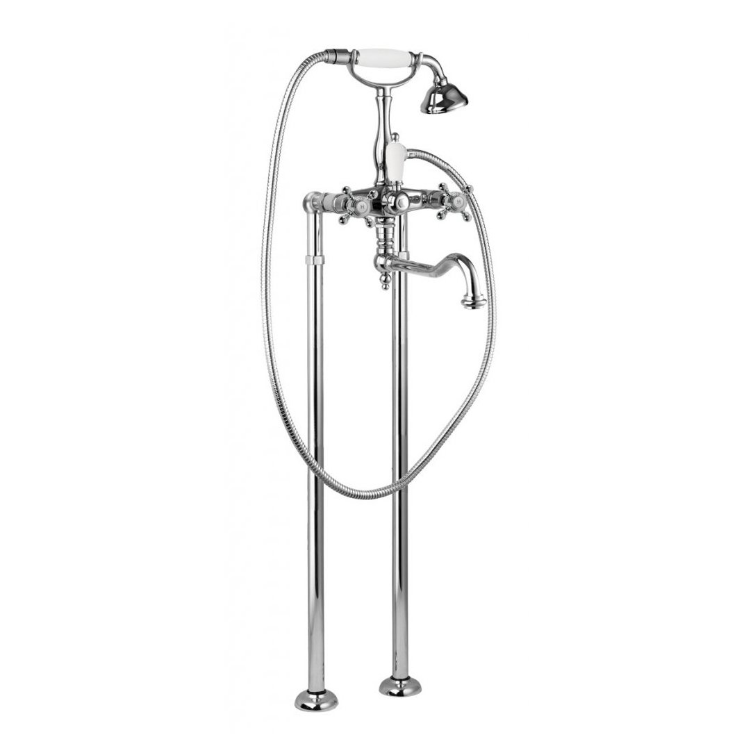 Напольный смеситель для ванны с ручным душем, цвет хром, ручки переключателя и ручного душа белые