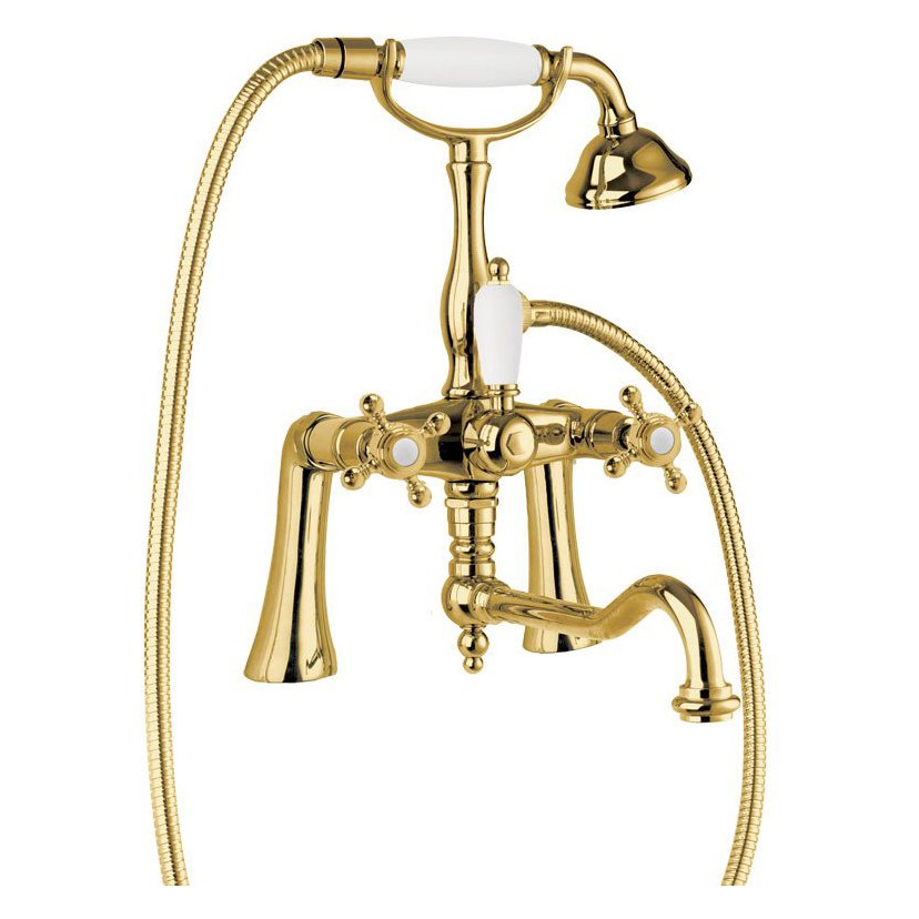 Смеситель на борт ванны с поворотным изливом и ручным душем, цвет золот, ручки переключателя и ручного душа белые