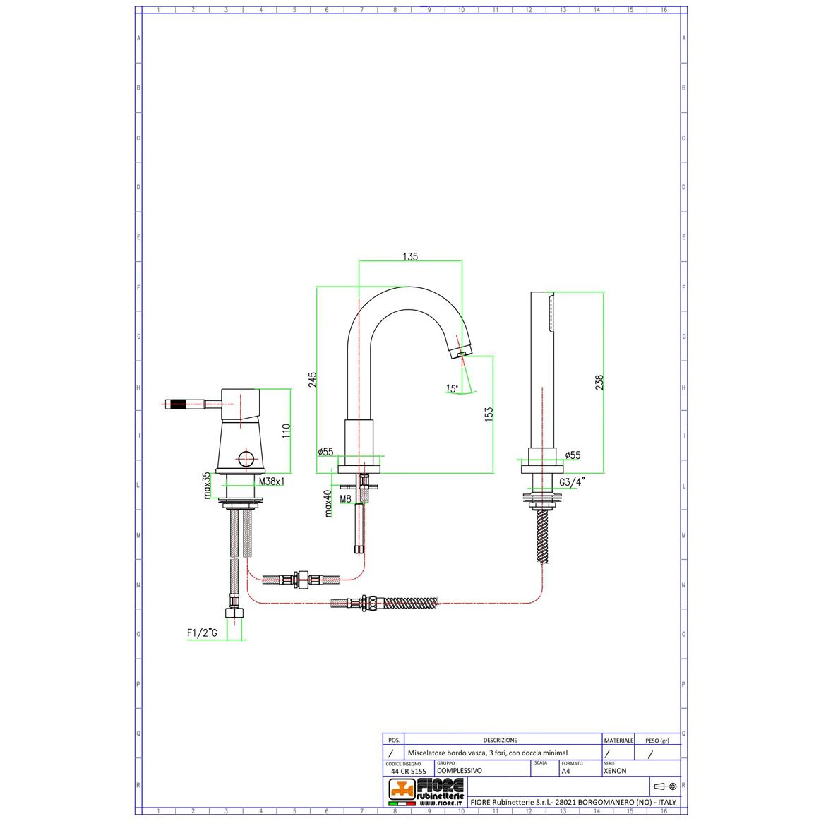 Смеситель на борт ванны Fiore (Фиоре) Xenon, (излив 13,5 см), на 3 отверстия, с набором для душа, цвет золото 44OO5155