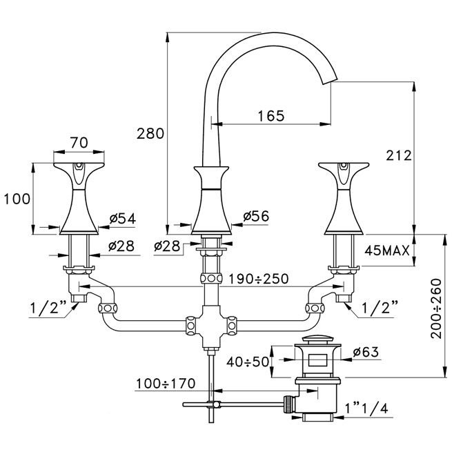 Stella 130 Смеситель для раковины на 3 отверстия 3225, с донным клапаном, цвет: хром
