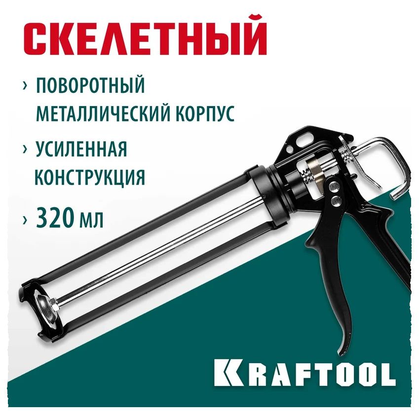 Полуоткрытый поворотный пистолет для герметиков 320 мл KRAFTOOL 06673_z01 предназначен для стандартных туб объемом 320 мл.