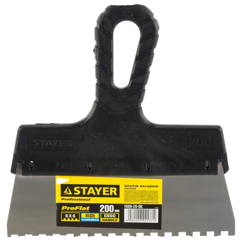 Шпатель фасадный Stayer (Стайер) Professional ProFlat, 200 мм, зуб 6 х 6 мм, пластиковая ручка, зубчатый, нержавеющий 1009-20-06