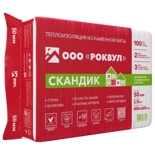 Базальтовая вата Rockwool (Роквул) Лайт Баттс Скандик 800х600х50 мм, 12 шт (35 кг/м3; 0.288 м3; 5.76 м2)
