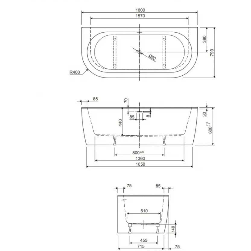 Пристенная акриловая ванна для установки одной одной стороной вплотную к стене.