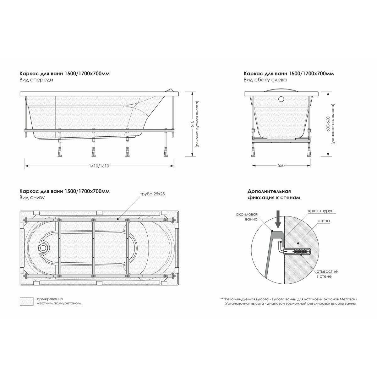 - Усиленная конструкция: каркасы Метакам обладают усиленной конструкцией, что гарантирует максимальную поддержку даже для больших и тяжелых ванн.