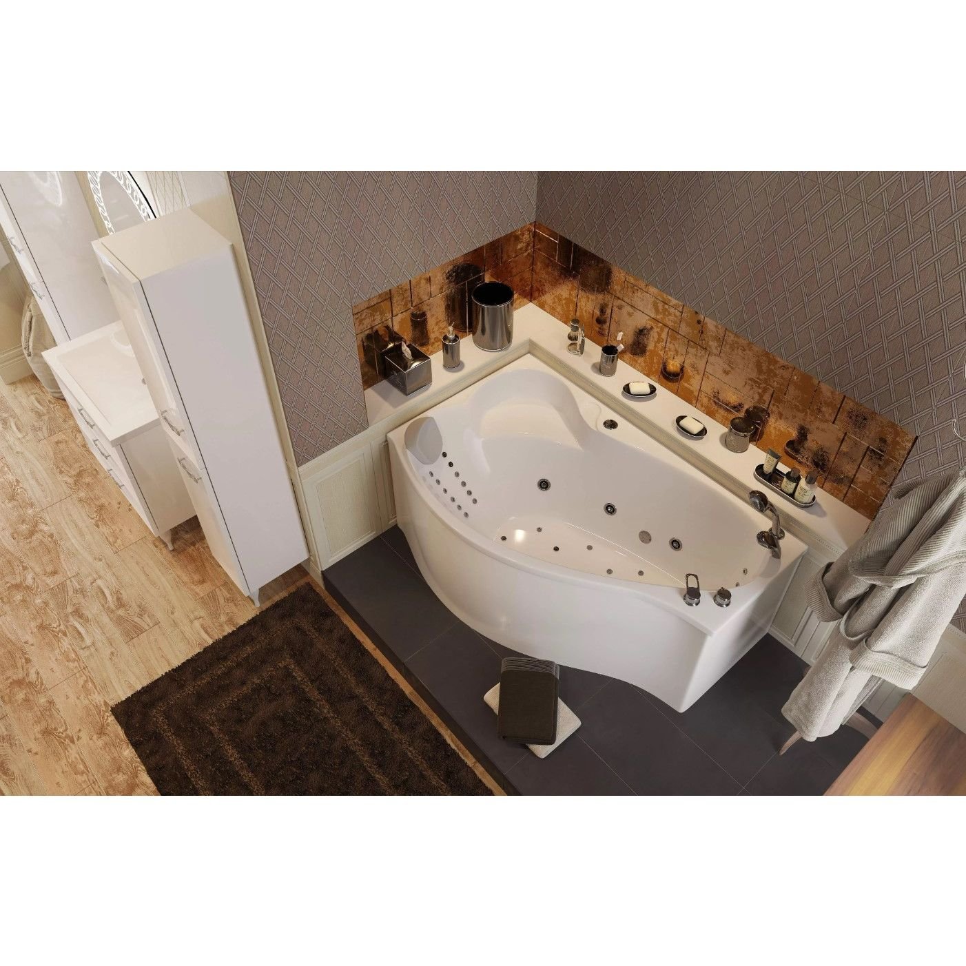 Ванна имеет асимметричную форму купели, что обеспечивает высокую вместимость и позволяет полностью погрузиться в теплую воду. Большая глубина ванны предотвращает разбрызгивание воды, делая водные процедуры еще более приятными.