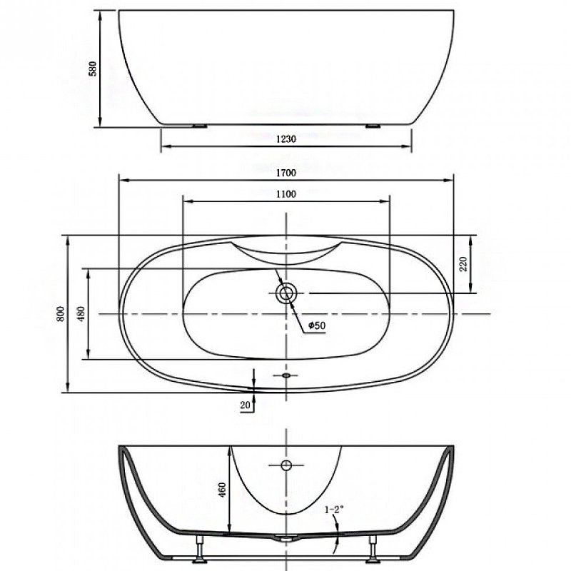 Ванна акриловая Vincea (Винчея) VBT-405B-1700 1700х800х580, цвет белый, слив-перелив в комплекте, хром, (без монтажного комплекта/ножек)