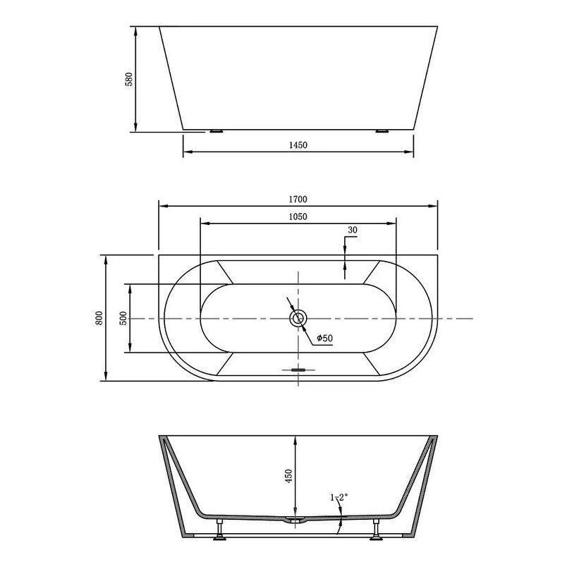 Ванна акриловая Vincea (Винчея) VBT-421-1700MB, 1700х800х580 цвет матовый черный, слив-перелив в комплекте, хром, (без монтажного комплекта/ножек)