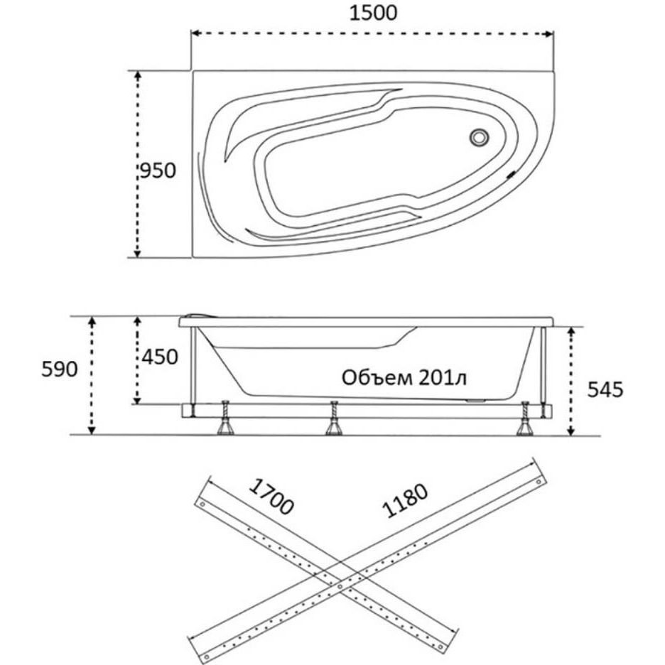 Ванна обрезная асимметричная Тритон (Triton) акриловая Madrid 1500х950х590 мм (Щ0000045644) (без монтажного комплекта/ножек)
