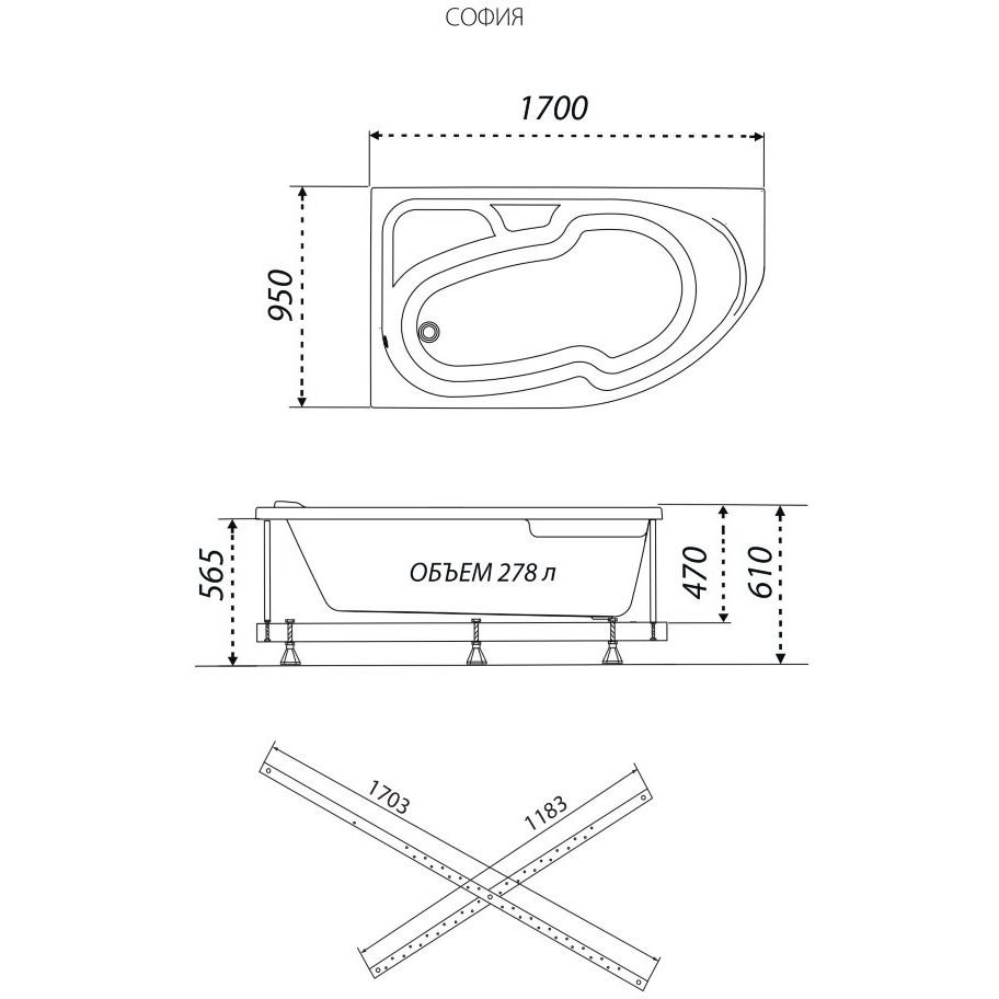 Ванна обрезная асимметричная Тритон (Triton) акриловая София 1700х950х610 мм левая (Щ0000046115) , (без монтажного комплекта/ножек)