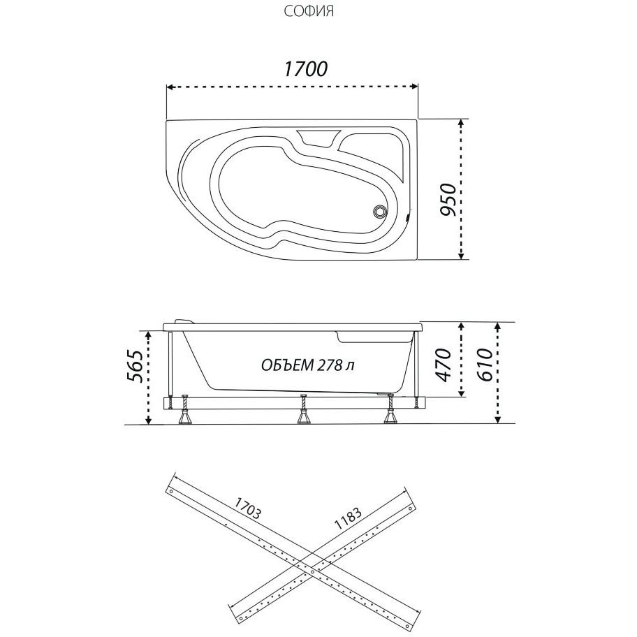 Ванна обрезная асимметричная Тритон (Triton) акриловая София 1700х950х610 мм правая (Щ0000046120) , (без монтажного комплекта/ножек)