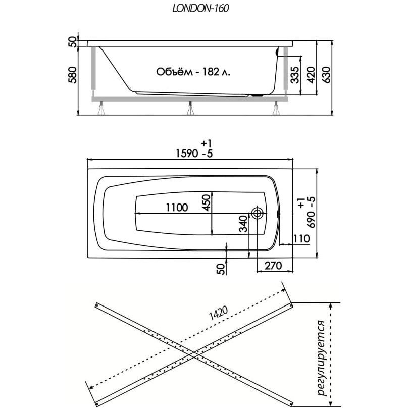 Ванна прямоугольная 1ACReal (1Ас Реал) акриловая London 1600х700х540 мм (Щ0000028736), (без монтажного комплекта/ножек)