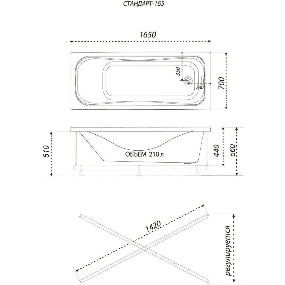 Ванна прямоугольная Тритон (Triton) акриловая Стандарт Экстра 1650х700х560 мм (Щ0000017402) , (без монтажного комплекта/ножек)