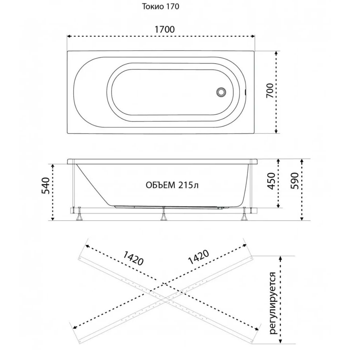 Ванна прямоугольная Тритон (Triton) акриловая Tokyo 1700х700х590 мм (Щ0000064075) (на Х-каркасе)