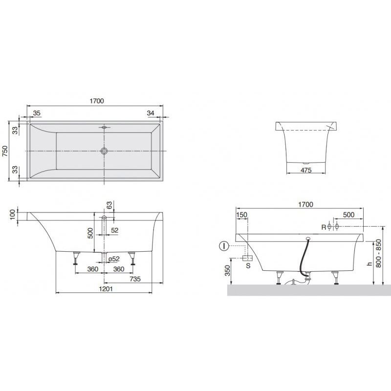 Ванна прямоугольная Villeroy and Boch (Виллерой энд Боч) Squaro материал Quaryl 1700х750х500 мм альпийская белая, (без монтажного комплекта/ножек)