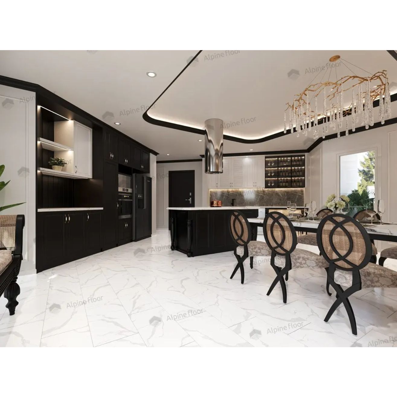SPC плитка Alpine Floor Stone Mineral Core – оптимальный вариант для отделки полов в помещениях с интенсивным транзитом и высокими эксплуатационными нагрузками. Используя сочетание плитки с каменной и деревянной фактурой, можно выделить зоны в совмещенном студийном пространстве. Выполнение стыка покрытий с разными рисунками не вызывает технологических сложностей, в отличие от стыковки плитки из натурального камня и деревянного паркета.
