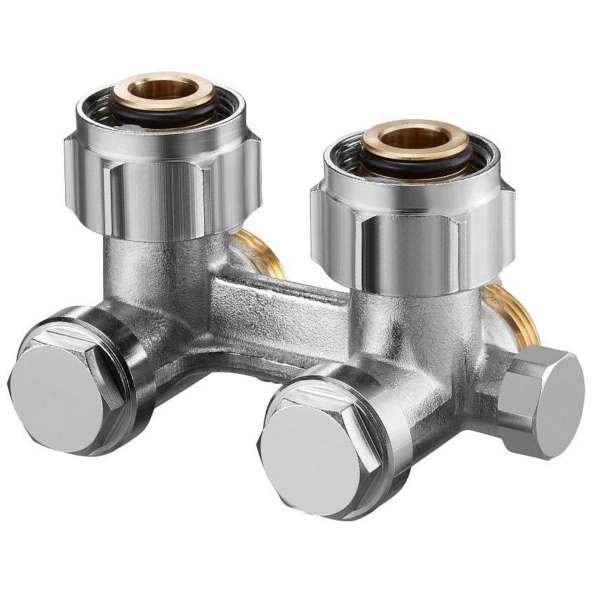 Узел нижнего подключения радиатора Oventrop Multiflex Z FBU. Выполнен из латуни, никелированный, межтрубное расстояние 50 мм, мягкое уплотнение, с преднастройкой.